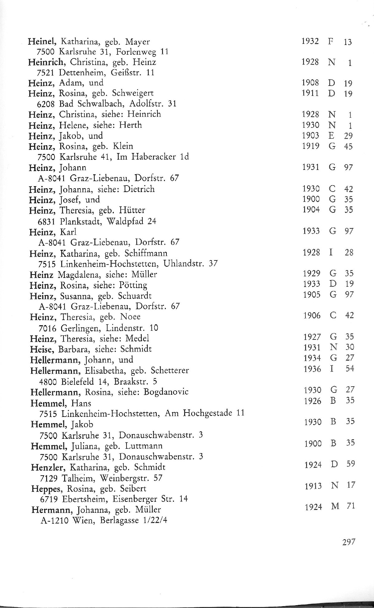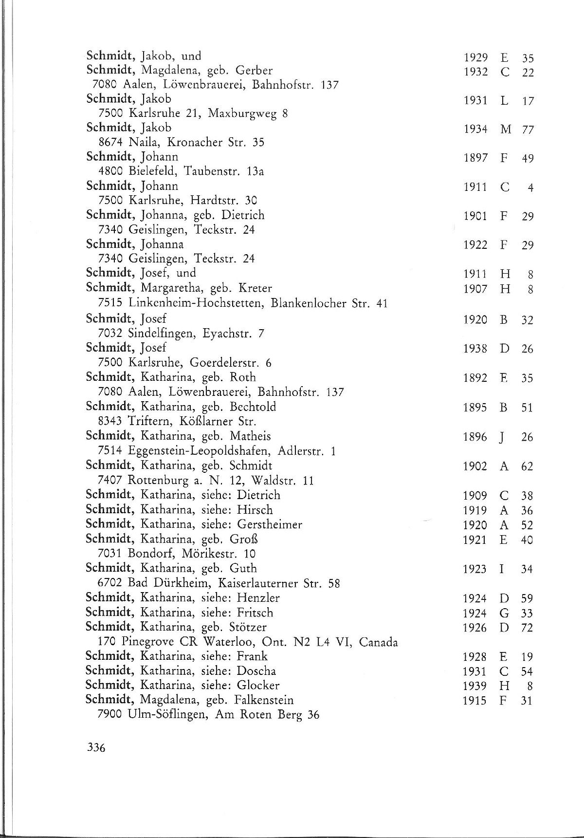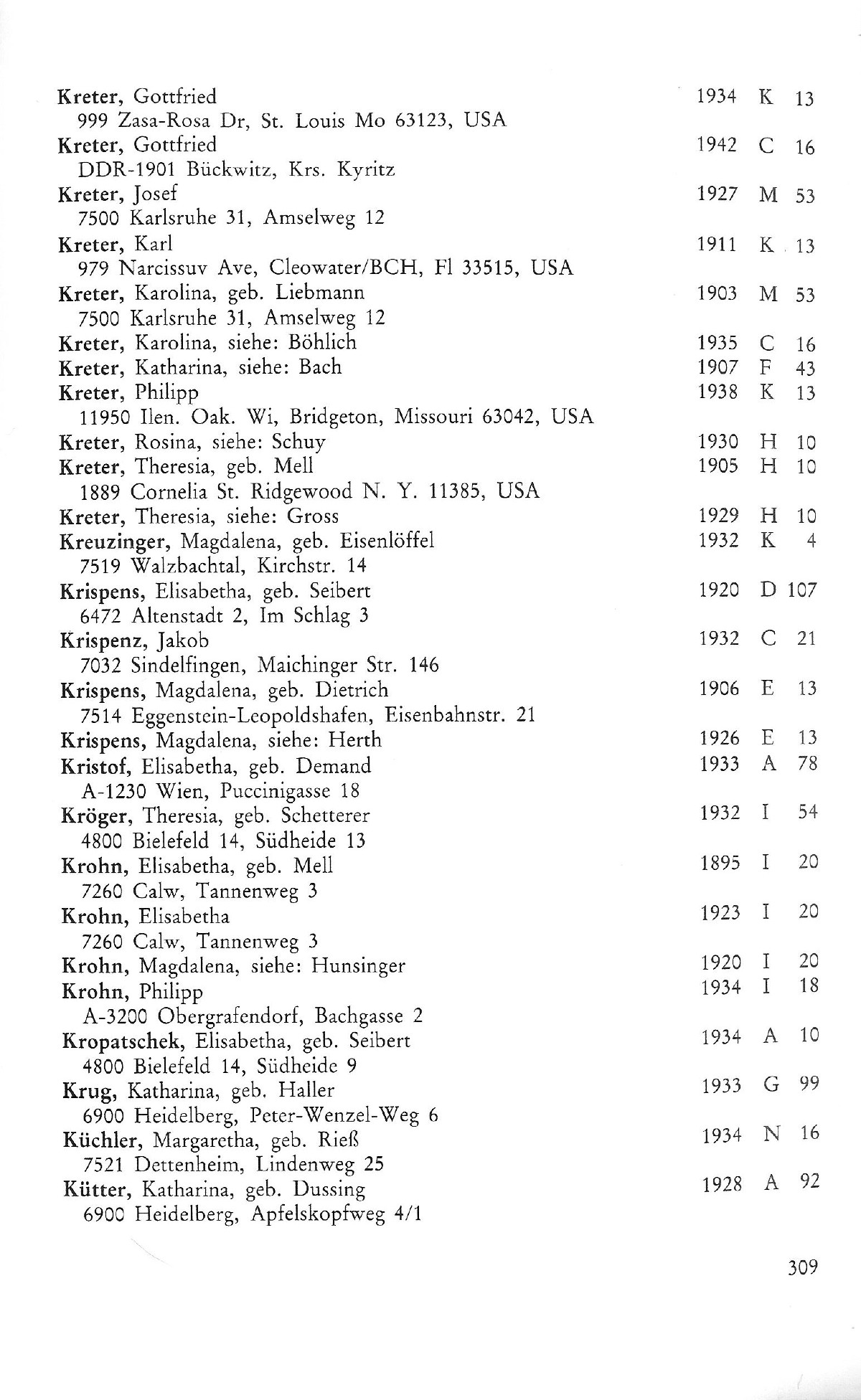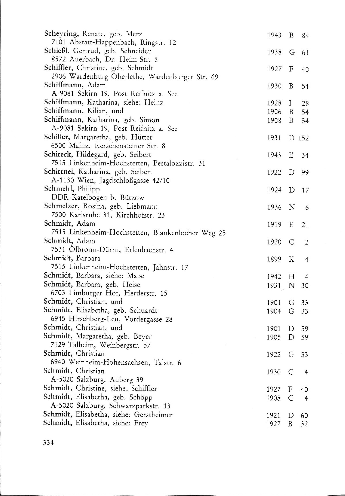 Die Namen sind alphabetisch geordnet; bei gleichem Familiennamen nach dem Vornamen (ausgenommen sind bei noch bestehenden Ehen die Ehefrauen, diese sind unmittelbar unter ihren Ehemännern verzeichnet); bei gleichem Familien- und Vornamen nach dem Alter. Hat sich der Familienname nach der Vertreibung geändert, so ist auch der Geburtsname in das alphabetische Verzeichnis aufgenommen mit dem Hinweis auf den jetzigen Familiennamen. Hinter dem Namen folgt das Geburtsjahr. Dieses ist deshalb sehr wichtig, weil es viele Personen mit gleichem Namen gibt (so z.B). 19 Schmidt, Katharina,9 Seibert, Jakob, 9 Schmidt, Heinrich). Der anschließende Buchstabe bezeichnet die Straße in Kischker und die Zahl die Hausnummer. Unter dieser Bezeichnung findet man in der Familienchronik (Seite 182 ff.) die Person und kann feststellen, zu welcher Familie sie gehört, und auf dem beigefügten Ortsplan, der die gleichen Bezeichnungen führt, kann man das Haus finden, in dem die Person in Kischker gewohnt hat.