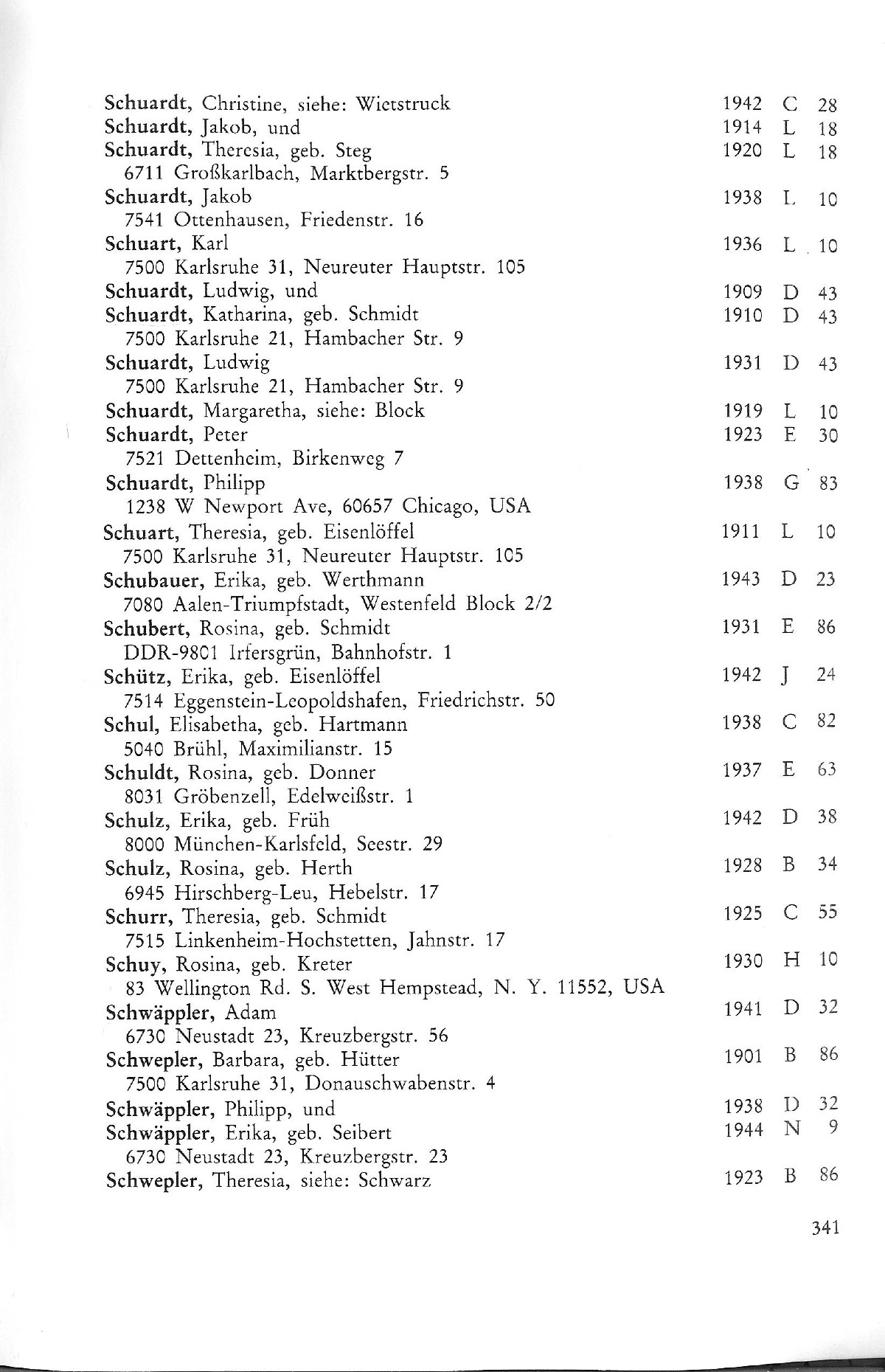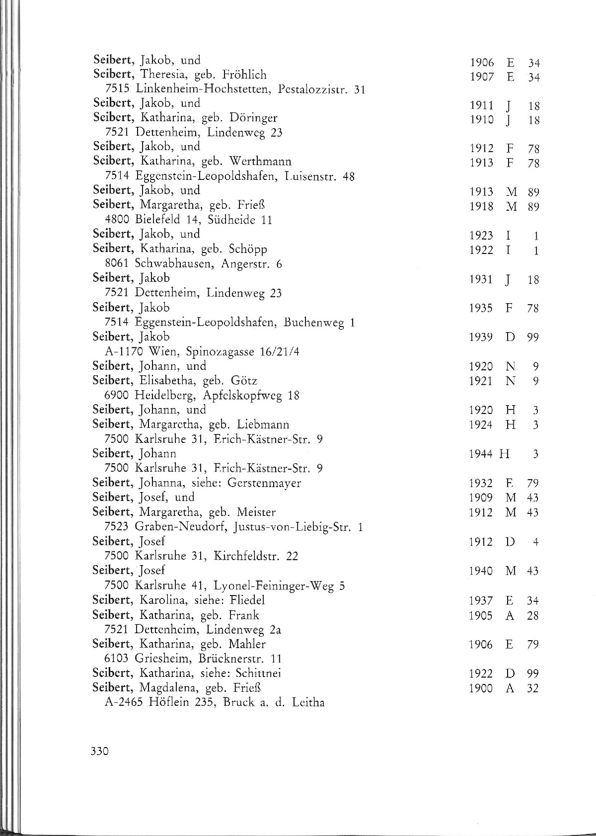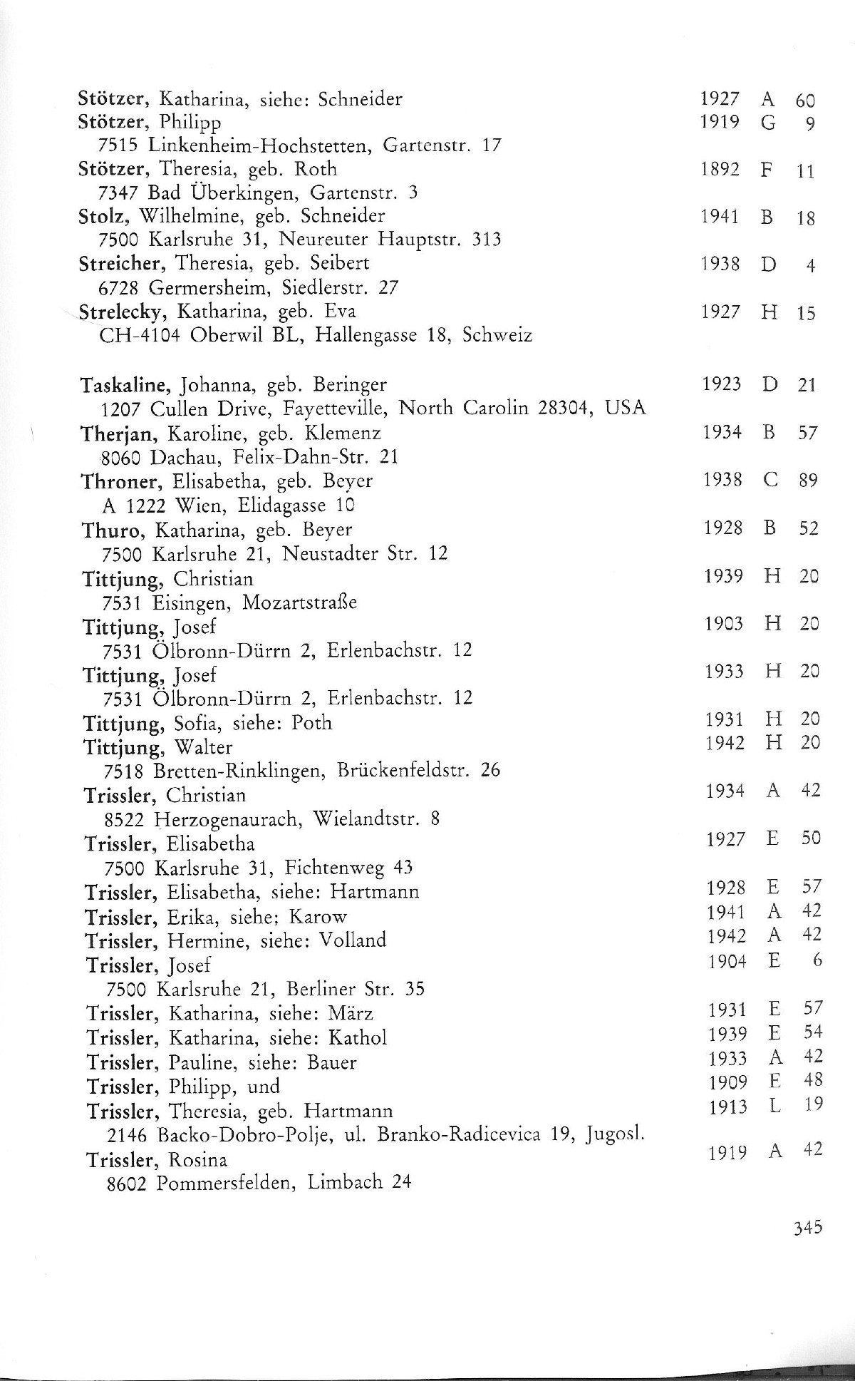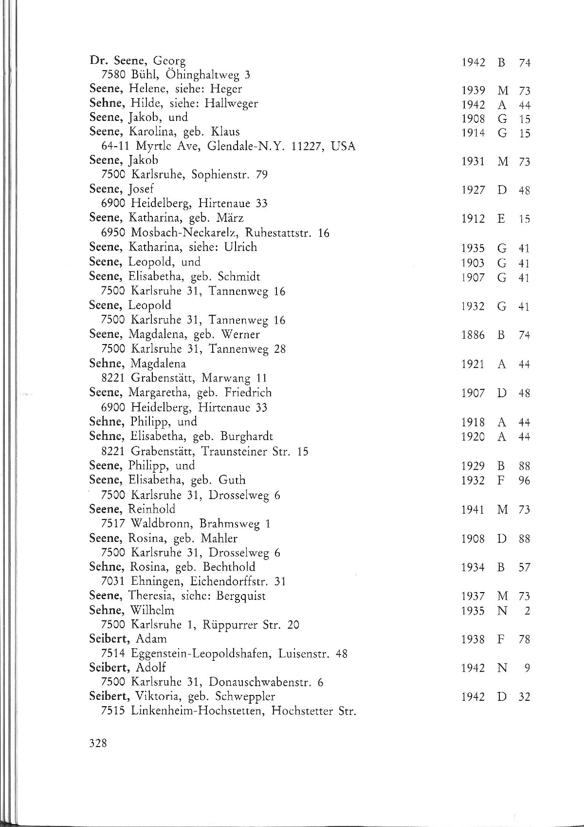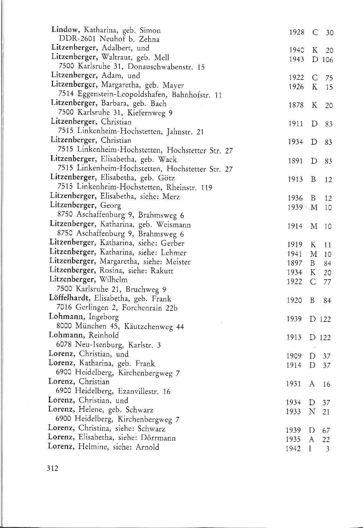 Die Namen sind alphabetisch geordnet; bei gleichem Familiennamen nach dem Vornamen (ausgenommen sind bei noch bestehenden Ehen die Ehefrauen, diese sind unmittelbar unter ihren Ehemännern verzeichnet); bei gleichem Familien- und Vornamen nach dem Alter. Hat sich der Familienname nach der Vertreibung geändert, so ist auch der Geburtsname in das alphabetische Verzeichnis aufgenommen mit dem Hinweis auf den jetzigen Familiennamen. Hinter dem Namen folgt das Geburtsjahr. Dieses ist deshalb sehr wichtig, weil es viele Personen mit gleichem Namen gibt (so z.B). 19 Schmidt, Katharina,9 Seibert, Jakob, 9 Schmidt, Heinrich). Der anschließende Buchstabe bezeichnet die Straße in Kischker und die Zahl die Hausnummer. Unter dieser Bezeichnung findet man in der Familienchronik (Seite 182 ff.) die Person und kann feststellen, zu welcher Familie sie gehört, und auf dem beigefügten Ortsplan, der die gleichen Bezeichnungen führt, kann man das Haus finden, in dem die Person in Kischker gewohnt hat.